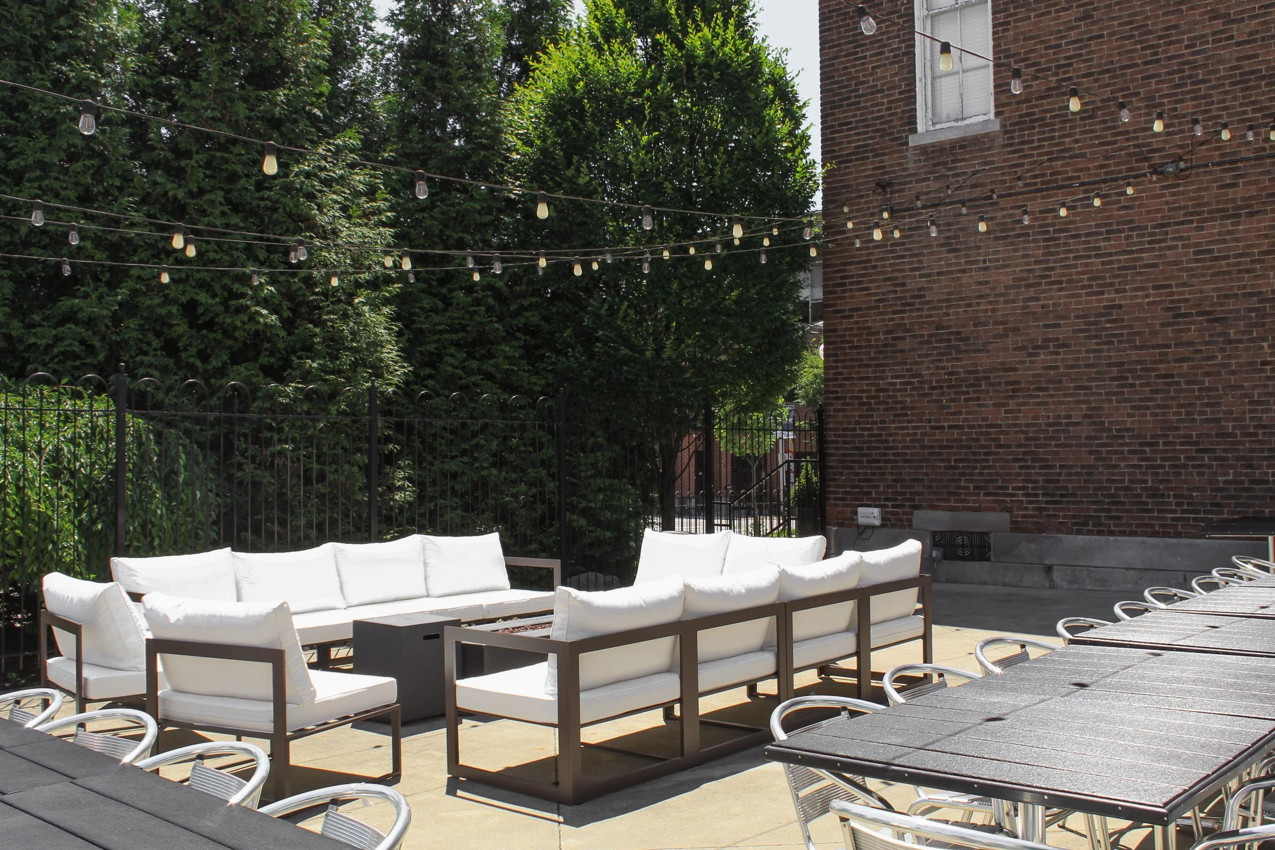 Walnut Street Patio is a spacious, private patio featuring seating for up to 100 guests or reception space for 150-175. The patio space includes romantic bistro lighting, lounge areas, heat lamps, and tables and chairs for seated events.